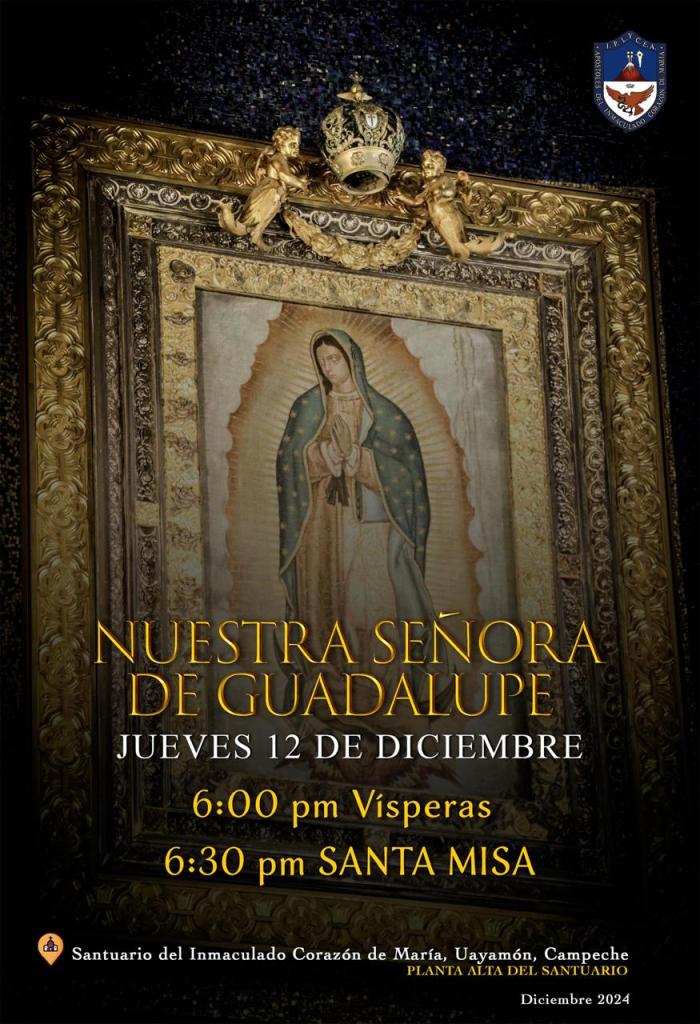 Ave María Purísima, se les invita a participar en la misa en Honor a la Santísima Virgen María de Guadalupe mañana jueves 12 de diciembre de 2024 en el Santuario del Inmaculado Corazón de María.