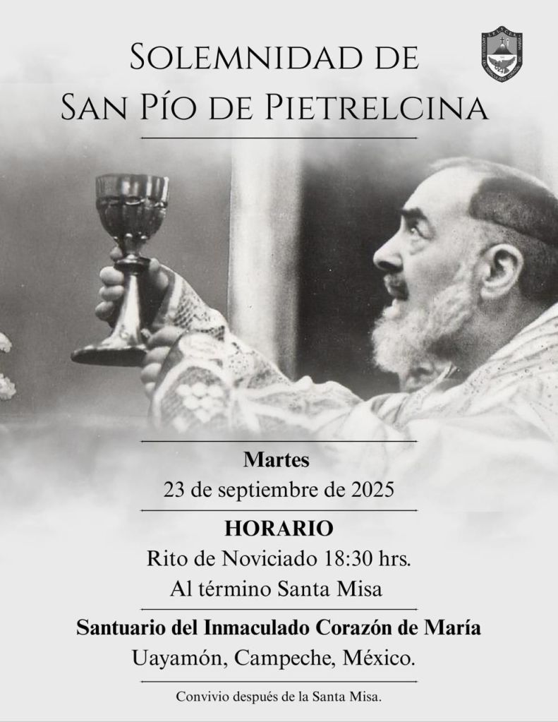 En la Tercera Orden San Pio de Pietrelcina, realizarán la novena de preparación del 14 al 22 de septiembre, para que el 23 de septiembre se consagren como Hijos Espirituales del Padre Pio después de la Santa Misa, iniciamos a las 6:30 de la tarde con el rito de noviciado.